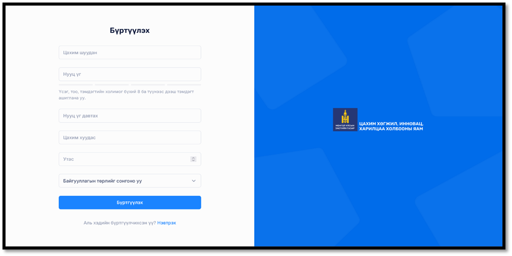 - Нууц үг: нууц үгийг үсэг, тоо, тэмдэгтийн холимог бүхий 8 ба түүнээс дээш тэмдэгт ашиглана.